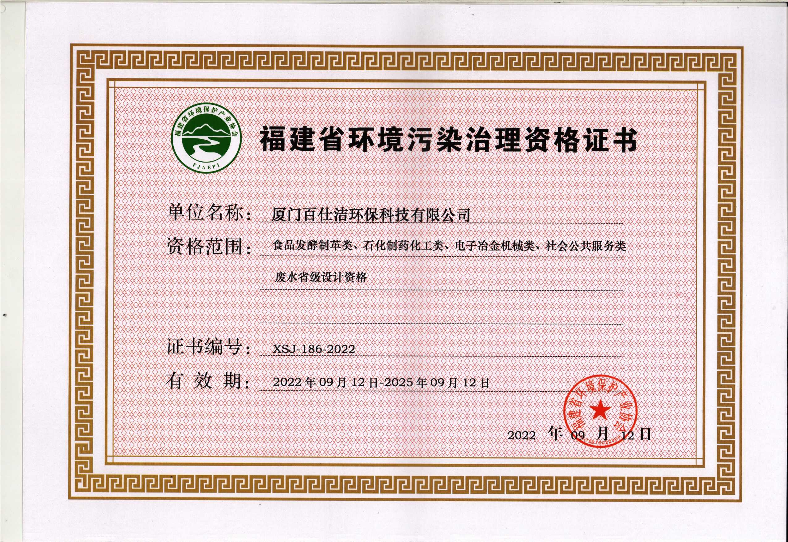 福建省環(huán)境污染治理設(shè)計資格證書